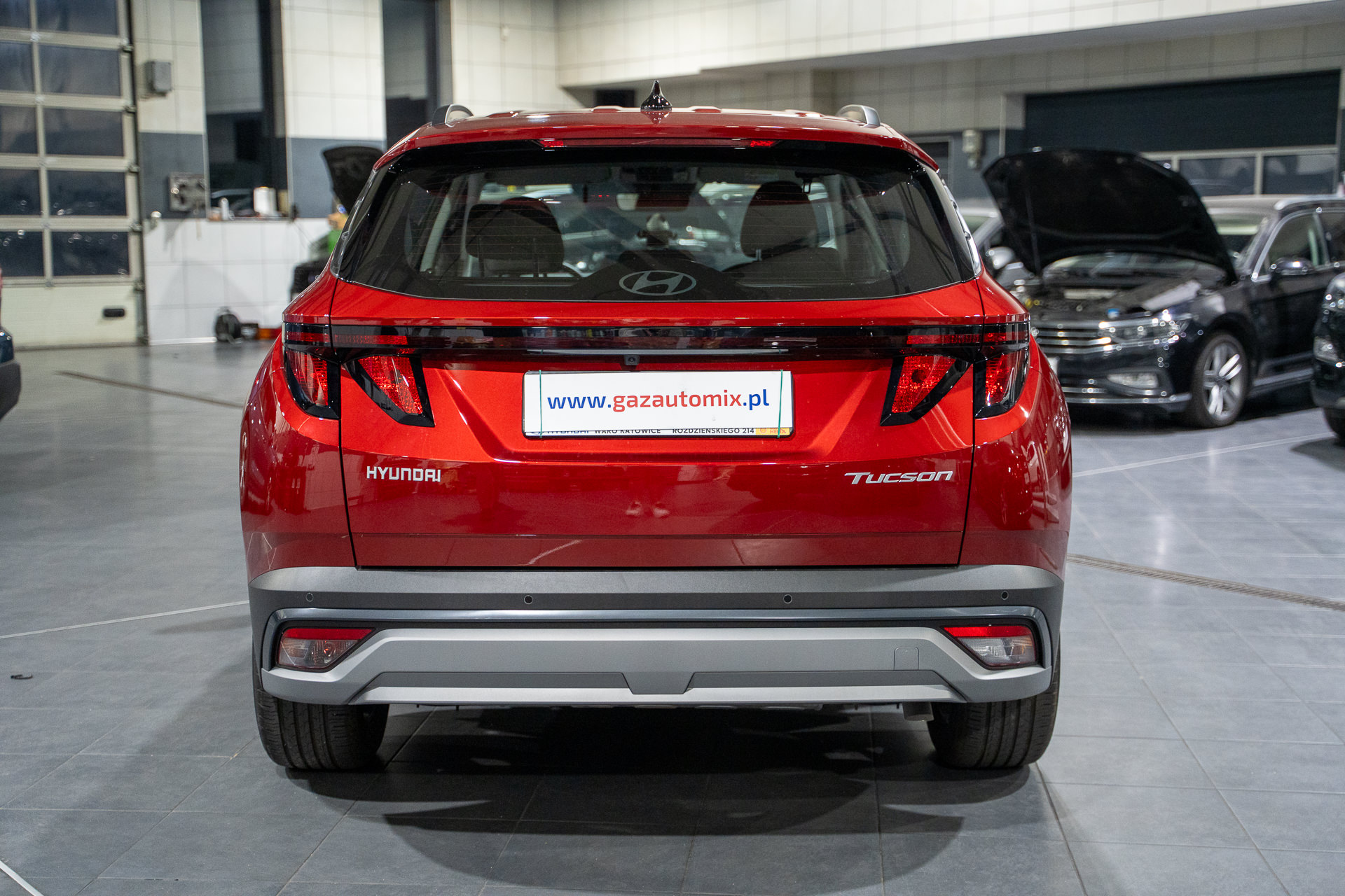 W opisywanym Hyundaiu Tucson 2025 zbiornik gazu toroidalny o pojemności całkowitej 52 litrów został umieszczony pod podłogą bagażnika. Dzięki 80-procentowemu poziomowi napełnienia użytkownik zatankuje realnie ok. 41 litrów LPG, przy zachowaniu pełnej funkcjonalności bagażnika — płaska podłoga i brak progu załadunku gwarantują codzienną użyteczność auta. Wlew gazu został zamontowany pod klapką wlewu benzyny, co uznawane jest za najwygodniejsze i najbardziej praktyczne rozwiązanie. Całość integruje się z oryginalną konstrukcją samochodu, umożliwiając tankowanie bez adaptera i zapewniając pełen komfort użytkownika.